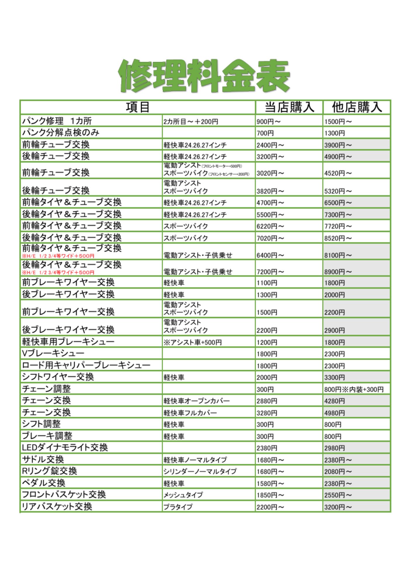 ※近隣ホームセンターで購入された自転車の修理は、表記とは別にサービス料として500円いただきます。